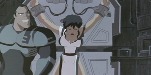 Tyler's first order of business is to scan worlds that were once Arakacian colonies. Best I can figure, the crystal also imparts a lot of knowledge to the owner; it might be the sudden influx of twisted information that drives people insane. The tyrant's searching pays off when a scan of Eden reveals traces of the immortality liquid. Flights of CGI attack craft swarm over the solitary settlement, launching CGI rockets that explode in CGI explosions over hand drawn buildings. Yes, it is that darn bad. You may have guessed that Eden was Julie's home. Both she and her father try to put up some sort of defense. It is amazingly successful, largely due to the invaders behaving like "Zaxxon" sprites. However, eventually the gutsy heroine is knocked down a cliff as her father rams an attacker's ship with his own. Bands of merciless raiders descend on the planet, taking away any survivors as prisoners. Kerrie is also taken, though Germain tries to protect her and is left to die on the ruined planet for his trouble.