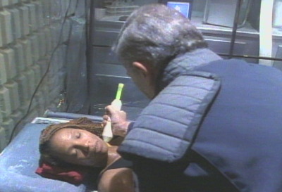 Back at the base, the unconscious Russian and desiccated corpses are placed in quarantine. Lazarus treats the badly fatigued survivor and performs autopsies. What he discovers is worrisome. The dead bodies seem to have been "used up," while the rescued crewman's metabolic rate is impossibly high. Lazarus suspects that some sort of virus is at work. The diagnosis makes Fife's actions seem idiotic. The Russian goes into cardiac arrest, so she breaks the quarantine seal and unsuccessfully attempts CPR (the demonstrated method is not recommended). The other characters dash in just as Fife is wiping slime off of her lips. You have probably guessed that something left the dead Russian and entered Fife.