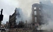 Rubble is scattered around the ground with smoke still rising from the hollowed-out building